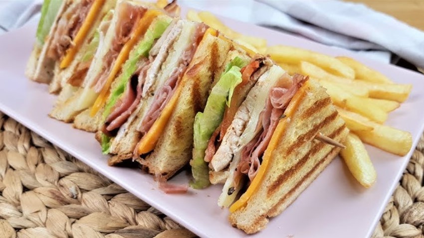 Un sándwich de tres capas lleno de sabor: pechuga de pollo a la parrilla, tocino crujiente, lechuga fresca, tomate maduro y mayonesa en pan tostado. Una combinación perfecta de ingredientes frescos y crujientes para un almuerzo o cena completa.